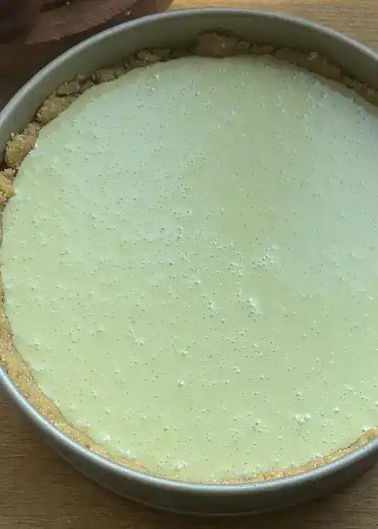6. Pour the filling into the prepared crust and smooth the top. Bake in a preheated oven at 170°C (340°F) for about 50 minutes. The edges should be set while the center remains slightly wobbly.