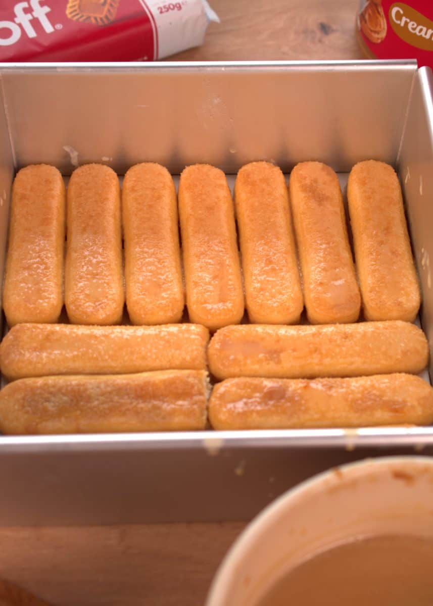 1. Start with the base of soaked ladyfingers.