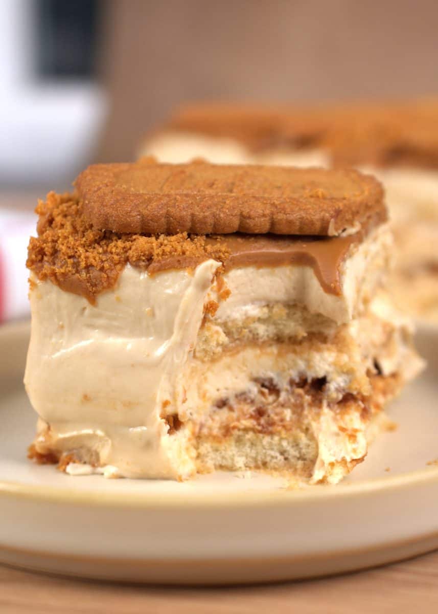 This recipe was so fun to create. We have a soft, soaked ladyfingers base topped with a creamy Biscoff tiramisu filling, soaked Biscoff cookies on top, another layer of filling, more ladyfingers, and a final layer of tiramisu filling. It’s all topped with a creamy Biscoff spread, crushed and whole biscuits.