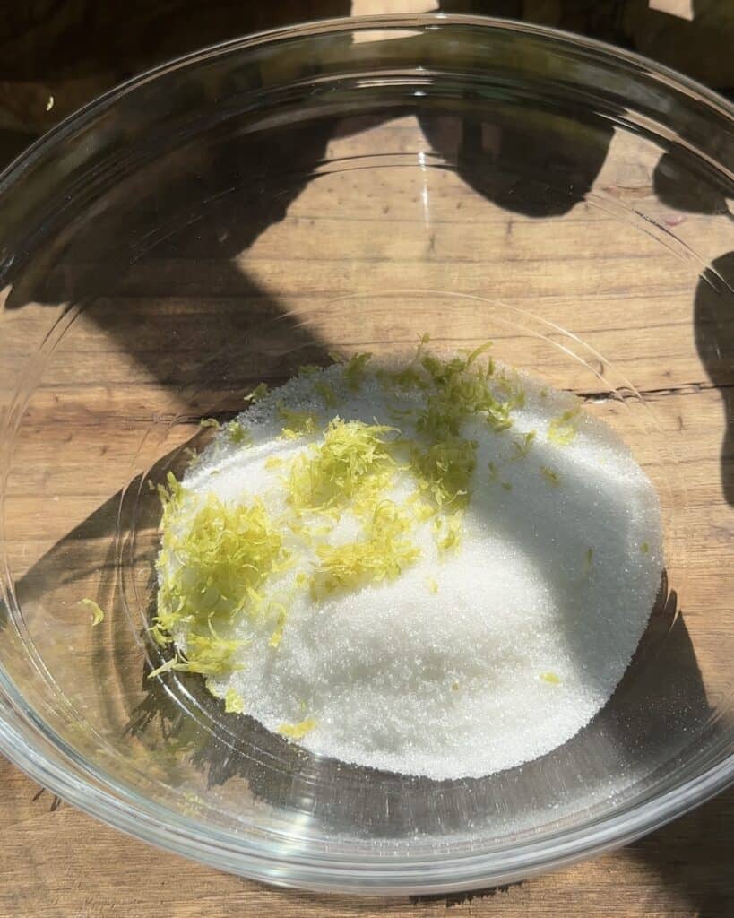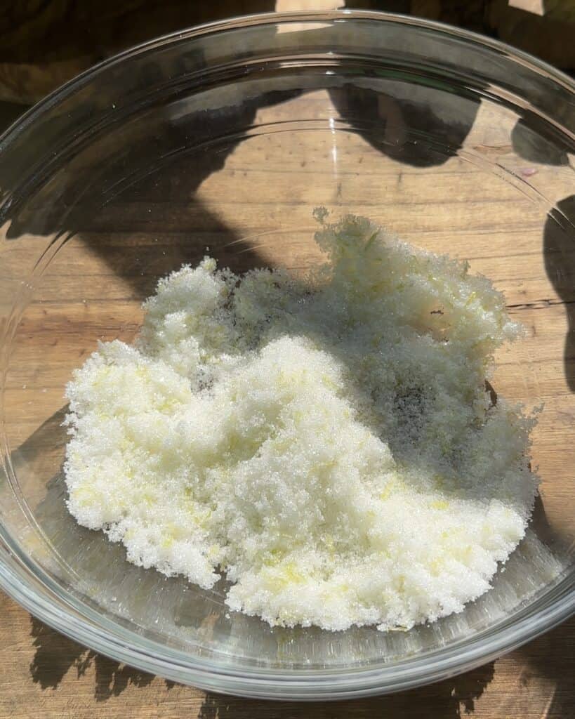 In a clean and dry bowl pour in the granulated sugar and the lemon zest. Rub them together using your fingers for about a minute so the zest can release all the natural oils.