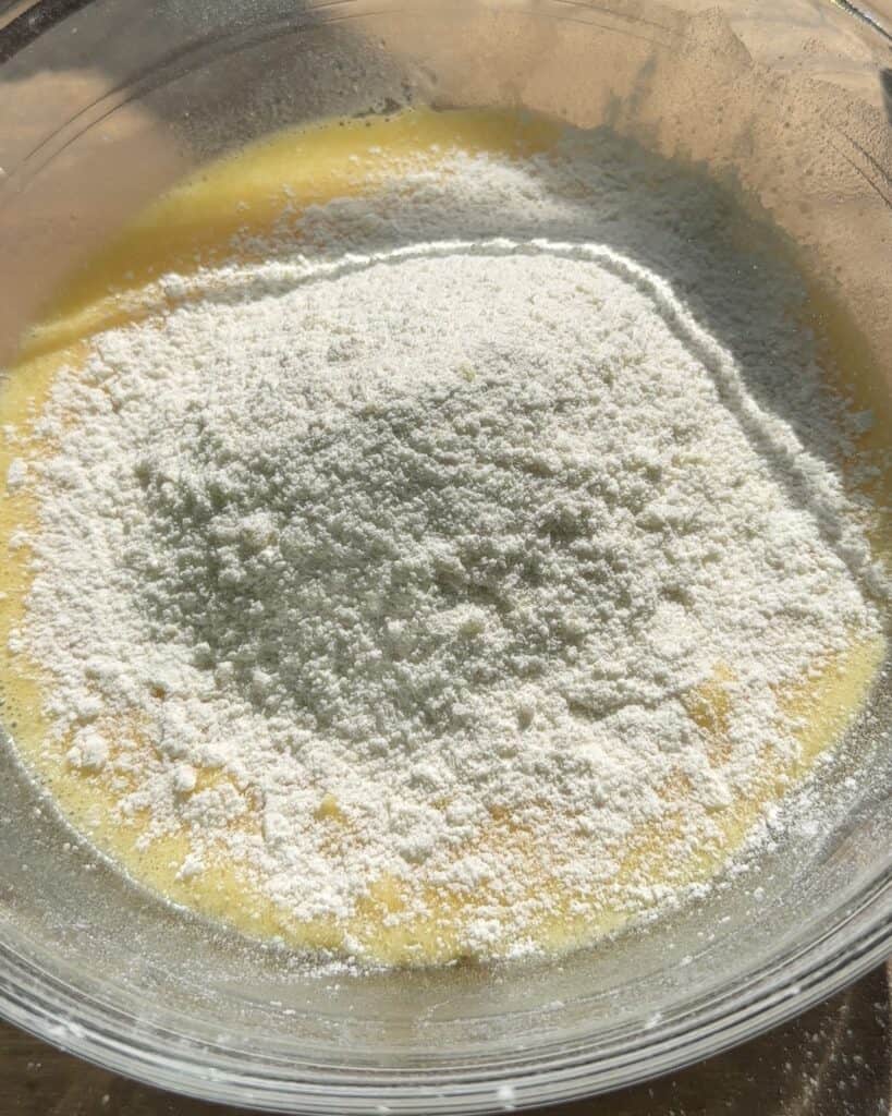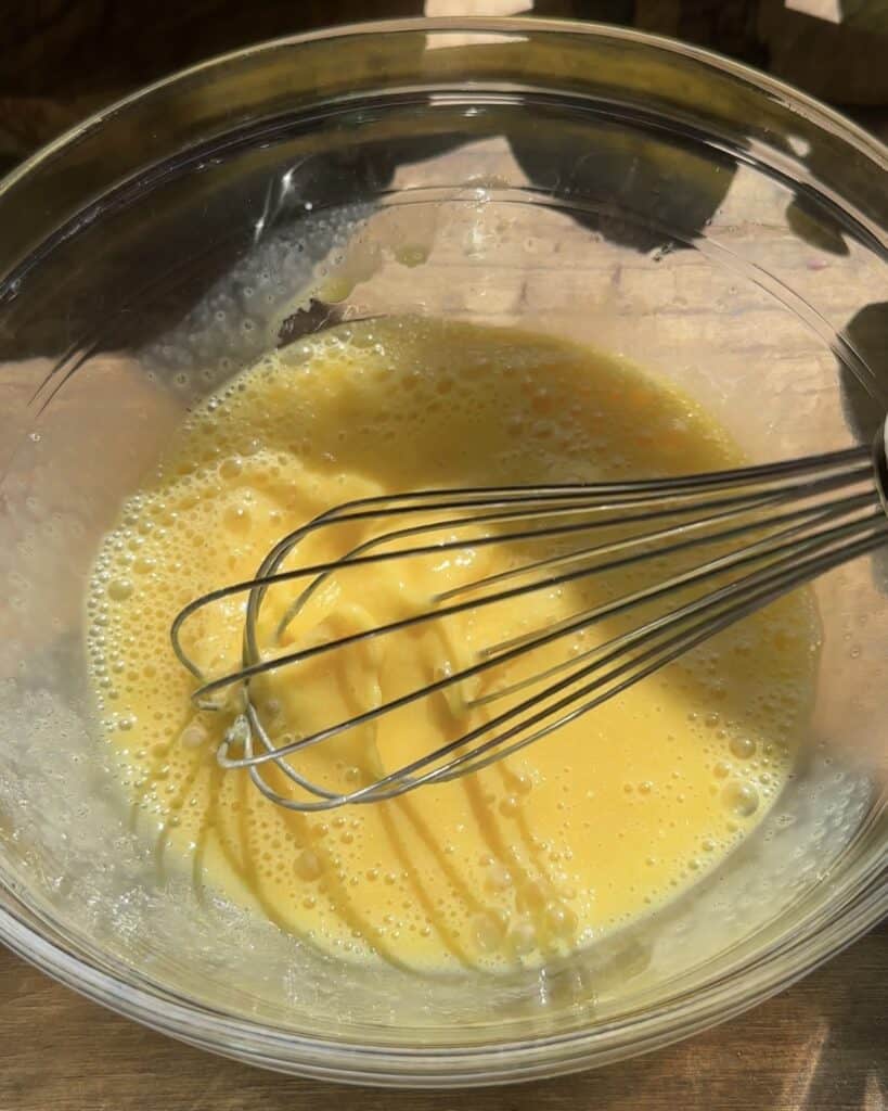 use a whisk for this step and beat all the eggs with the oil and the milk until you can see them becoming smooth with no egg lumps.