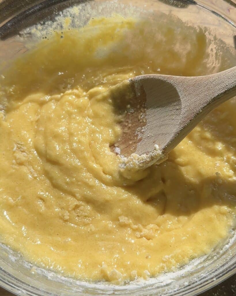 - use a whisk for this step and beat all the eggs with the oil and the milk until you can see them becoming smooth with no egg lumps.