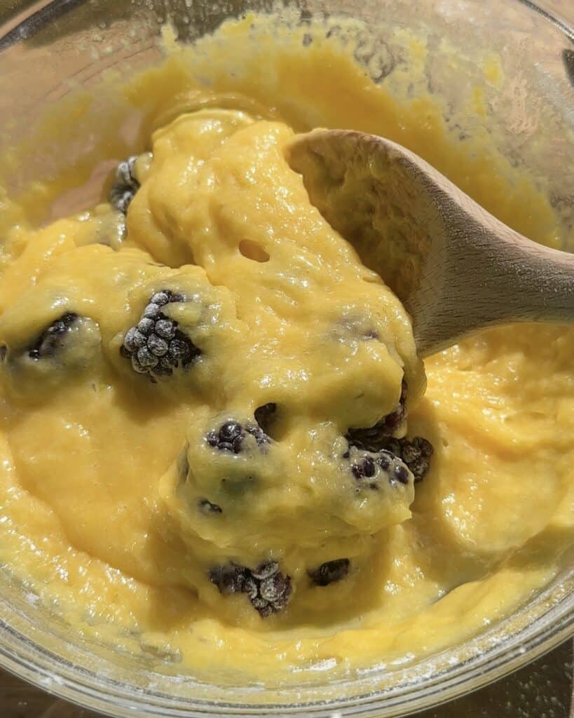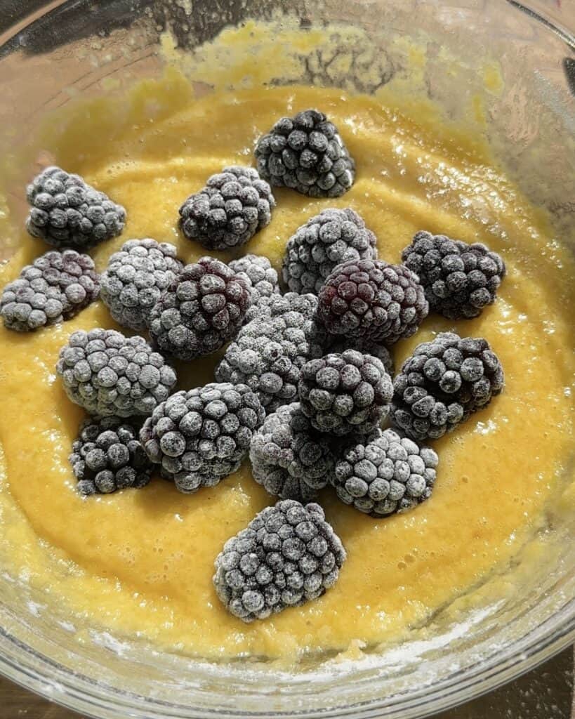 Add some flour to the blackberries and mix them a little bit so they don’t sink when baking. Only do this if they’re frozen. Add them to the batter and give them a quick mix.