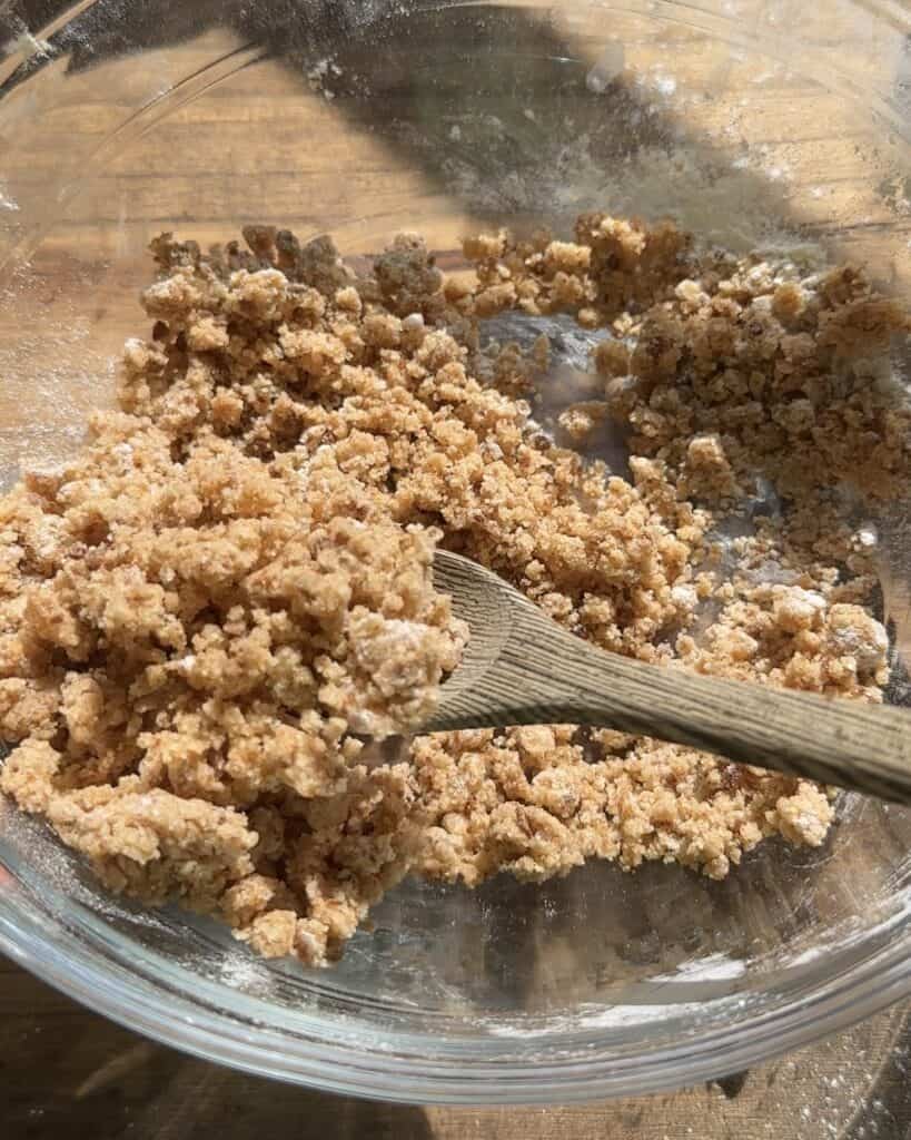 - In a bowl combine granulated sugar, some lemon zest, brown sugar, all purpose flour and soft butter. Use your fingers to it the butter into the mixture until it resembles wet crumbs. The butter should be evenly distributed throughout the mixture. Keep in the fridge for later.
