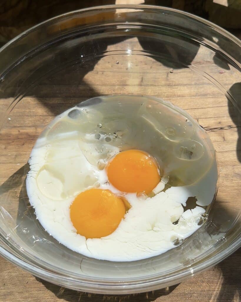 In a separate bowl crack 2 really small eggs or 2 eggs and use only 1 and a half. To use one and a half you wanna crack one egg into a bowl, beat it with a whisk, separate half of it and store it in the fridge to use on another recipe and to the half egg that was in the bowl add one more egg so you can have one and a half.