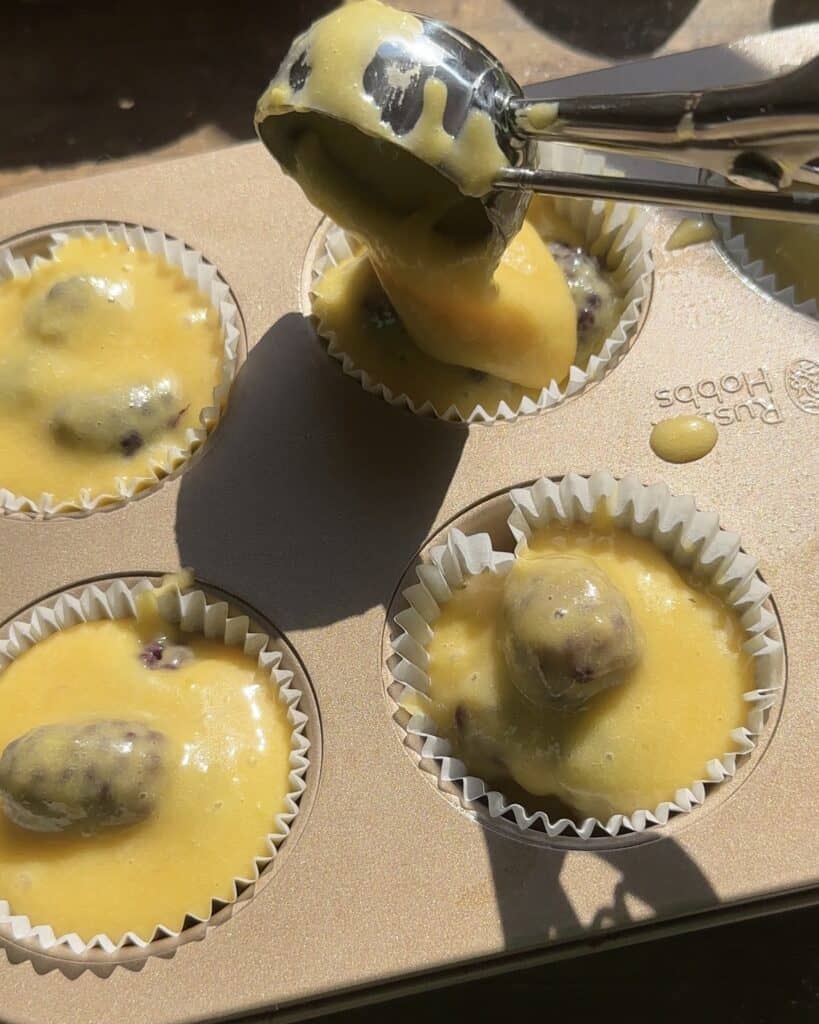 - Add some flour to the blackberries and mix them a little bit so they don’t sink when baking. Only do this if they’re frozen. Add them to the batter and give them a quick mix.