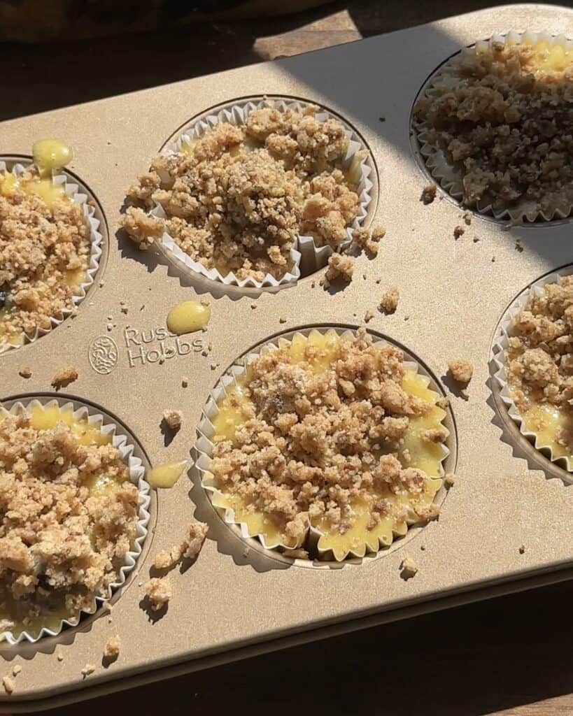 - Fill them to the top with the batter and add the crumble on top.