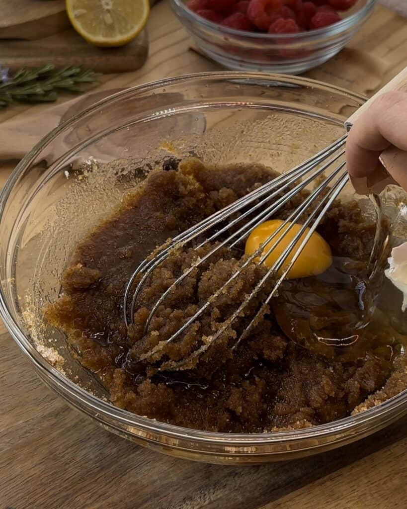 - In a mixing bowl you wanna pour in your brown butter, granulated sugar, vanilla extract, brown sugar and mix. Crack two eggs and mix them with the sugar.