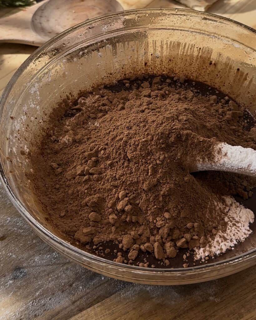 You can add the dry ingredients to the chocolate, start by adding granulated sugar, brown sugar, all purpose flour and cocoa powder, mix until everything is well combined.