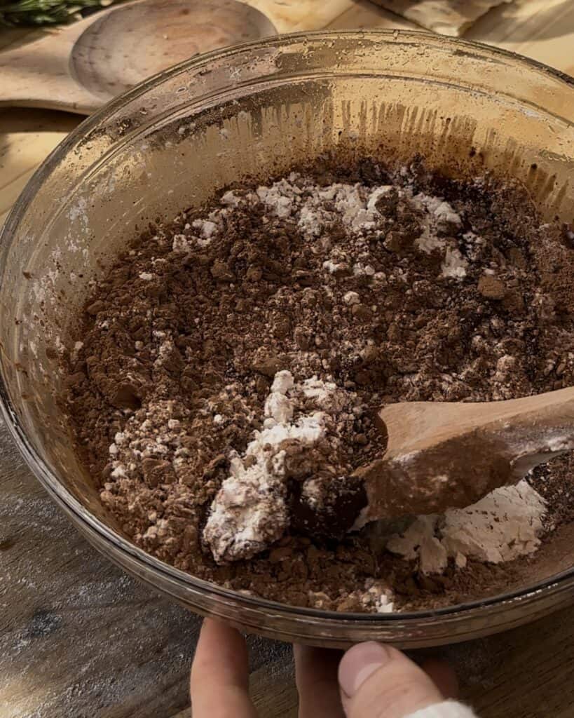 - You can add the dry ingredients to the chocolate, start by adding granulated sugar, brown sugar, all purpose flour and cocoa powder, mix until everything is well combined.