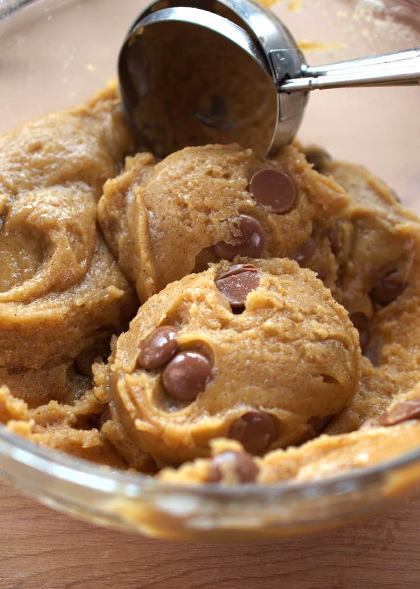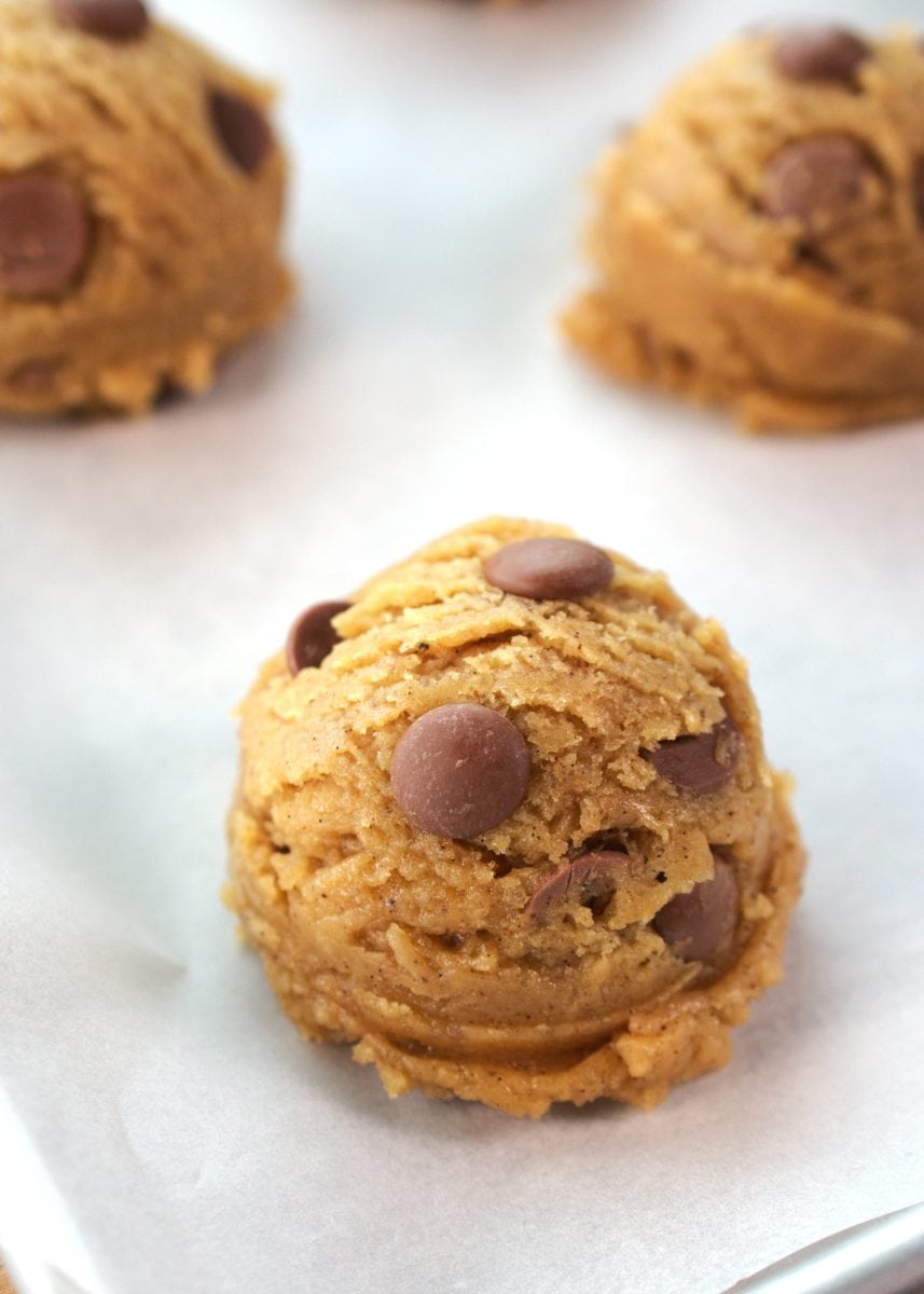 - Let the cookie dough sit in the fridge for about 15-25 minutes. Then scoop it into a baking tray lined with parchment paper. Use a large tray so they have space to spread.