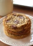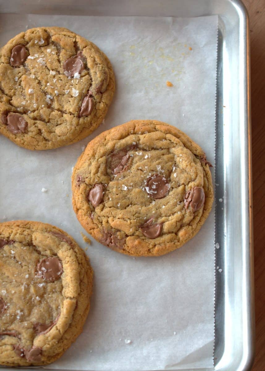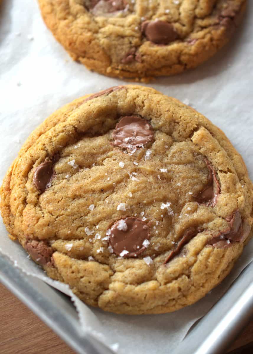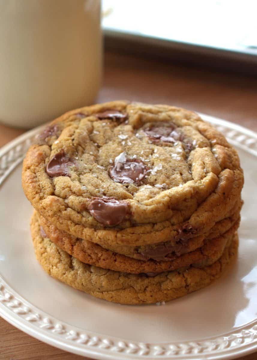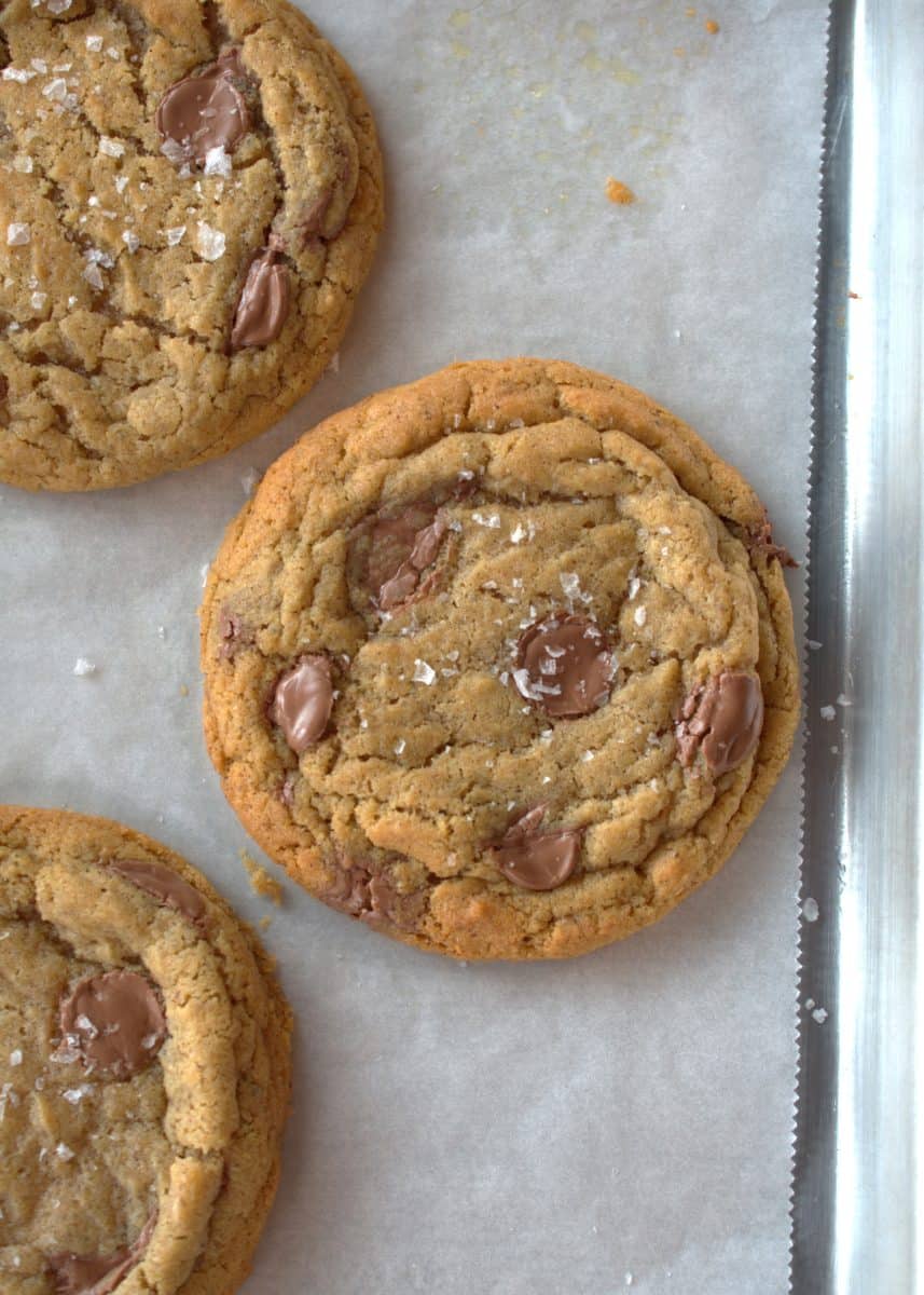 Delicious brown butter chocolate chip cookies. They have crispy edges and a chewy interior.