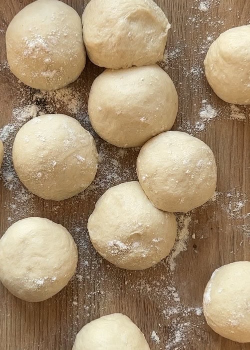 1. Once the dough has proofed and doubled in size, divide it into 12 equal pieces, each weighing about 64 grams.