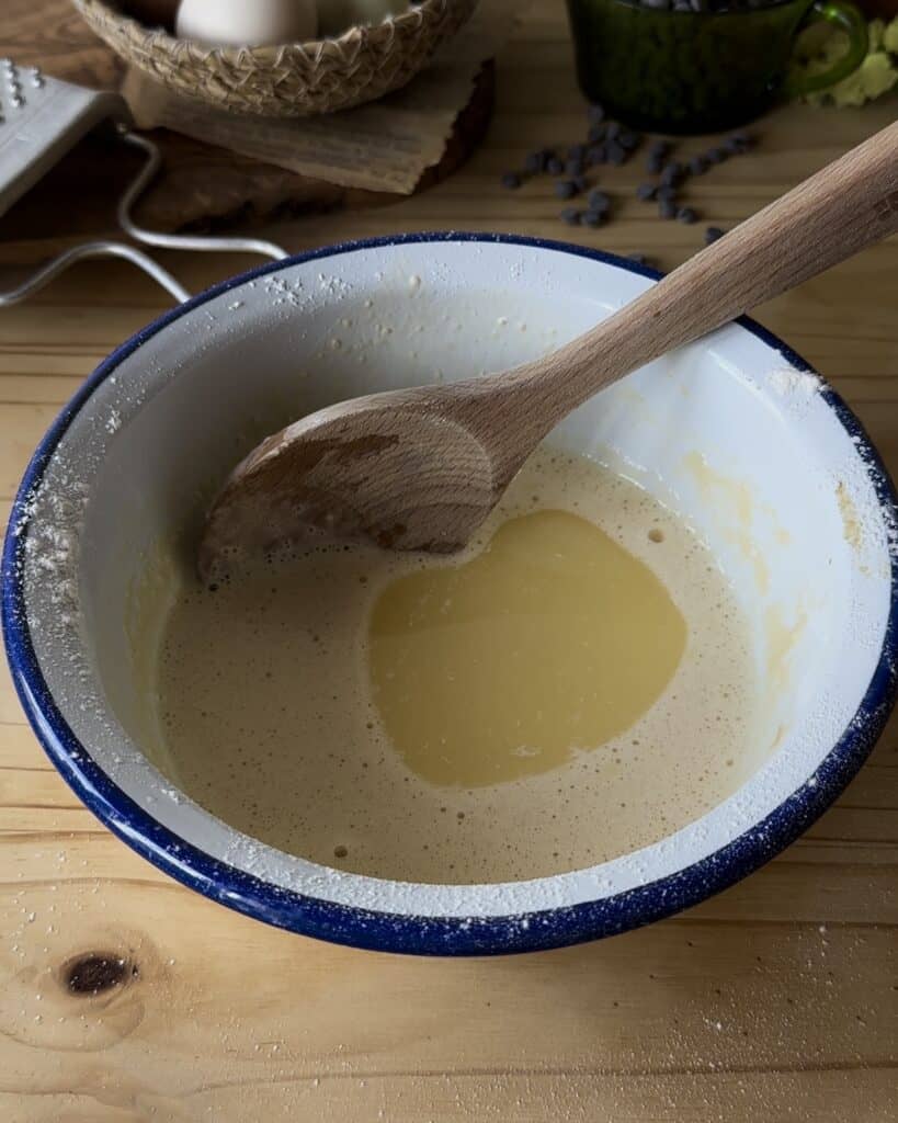 once you’ve added the dry ingredients you wanna mix it making sure to incorporate the dry ingredients throughly into the wet mixture to create a smooth batter. Add the melted butter and mix again.