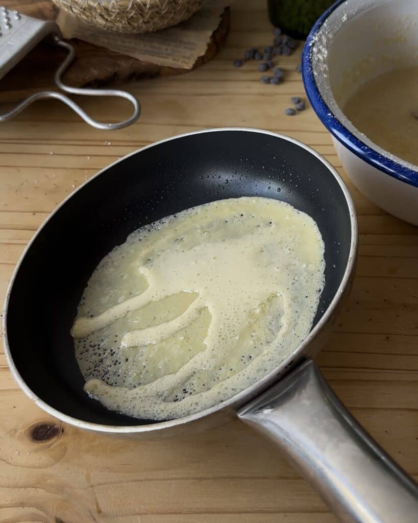 Take about 1/10th o the batter and pour it onto the center of the warm pan. Immediately tilt the pan in a circular motion, spreading the batter to cover the entire surface.