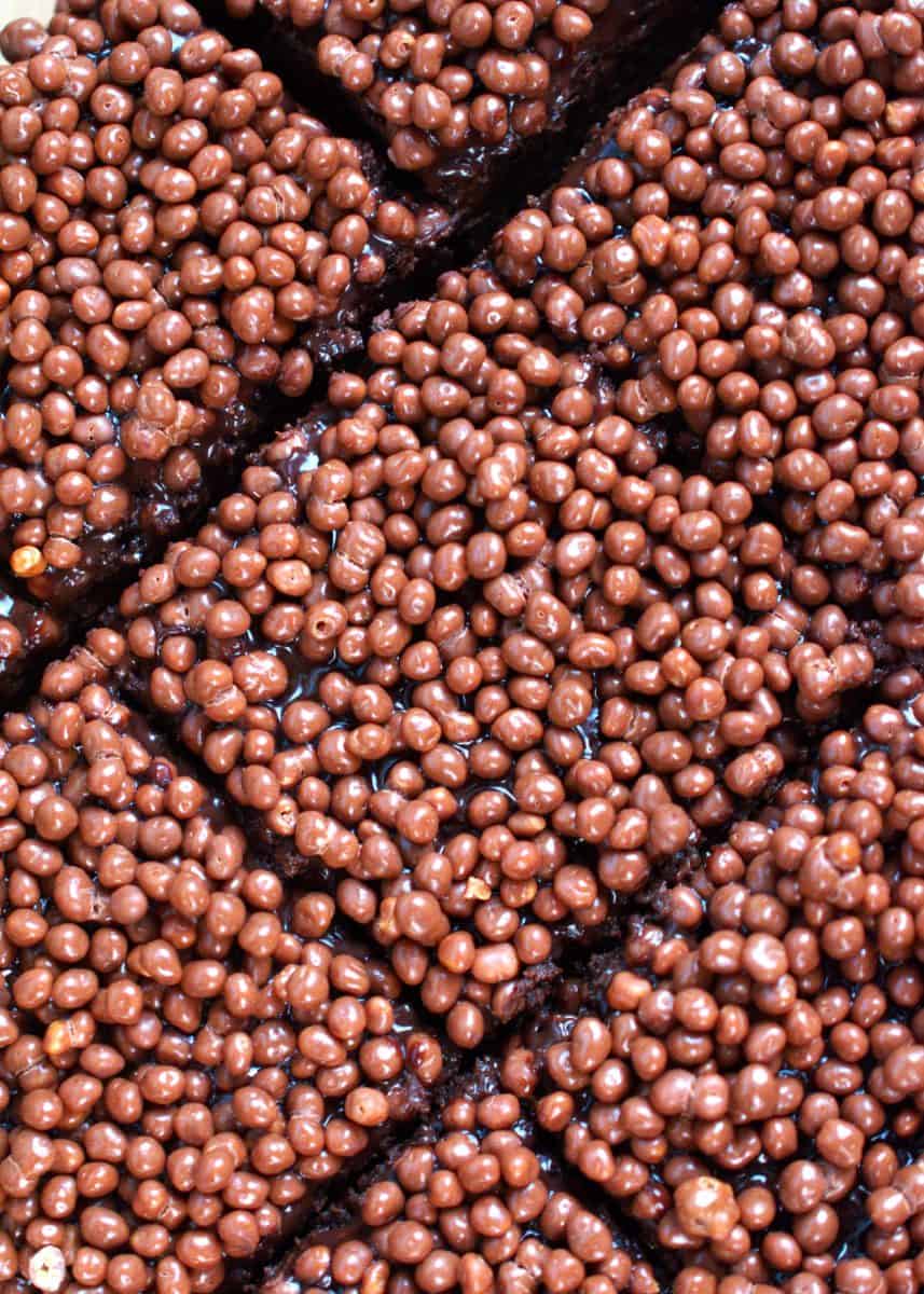- Build the cake: cut the sides and the top if it’s not straight. Slice the cake in half so you have two cakes. Use the same parchment paper to cover the pan and add one of the cake slices. Spread chocolate ganache. If you cut the sides of the cake, add ganache to the space, too. Add another cake layer and another thick layer of chocolate ganache. Cover the whole pan with the ganache. Sprinkle 4-5 cups (150g) of puffies over the top. Make sure to cover the entire surface. Refrigerate until the ganache has set. It can take about 1-3 hours. Slice and serve.