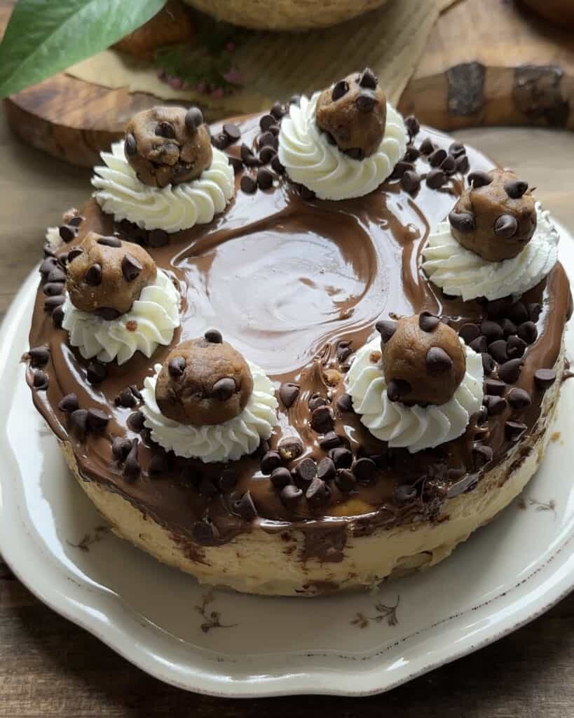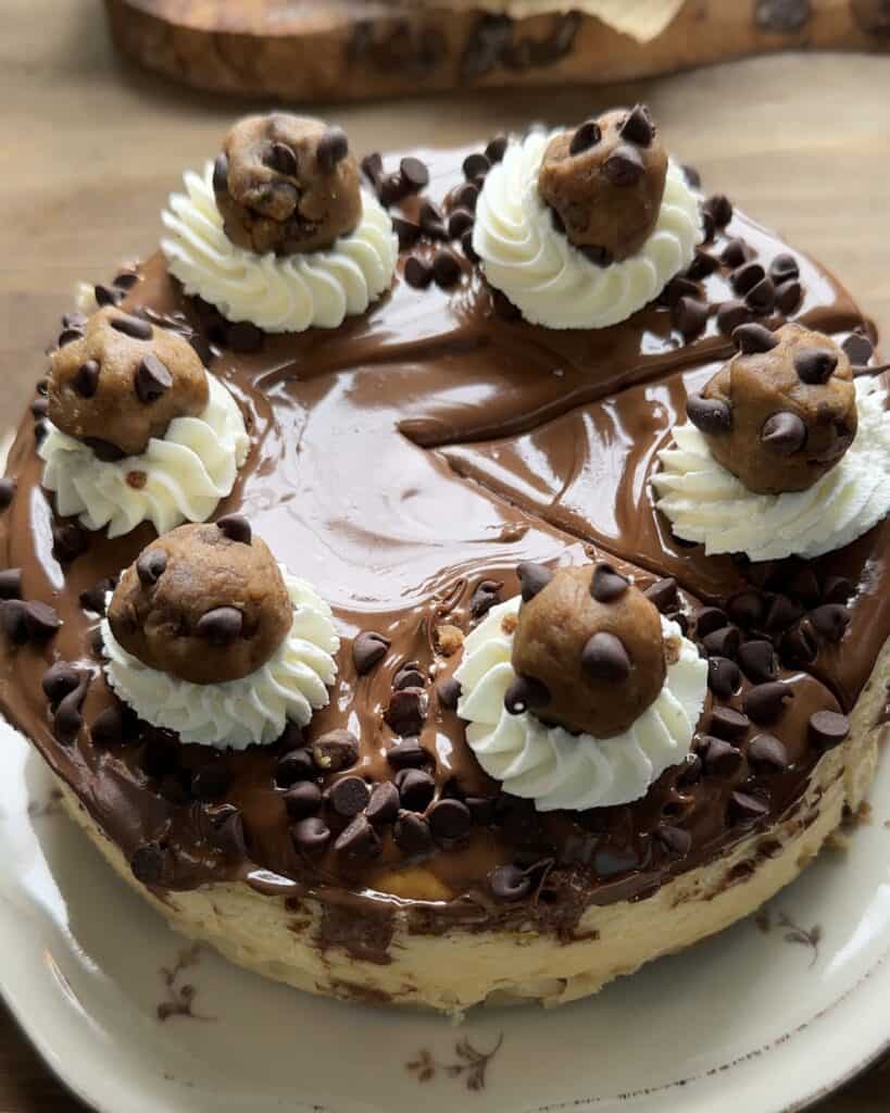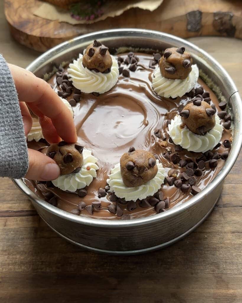 - Pour the chocolate ganache all over the cheesecake, add chocolate chips on the sides and then add whipping cream on top. Decorate with more cookie dough and its ready to eat! I hope you enjoy this recipe.