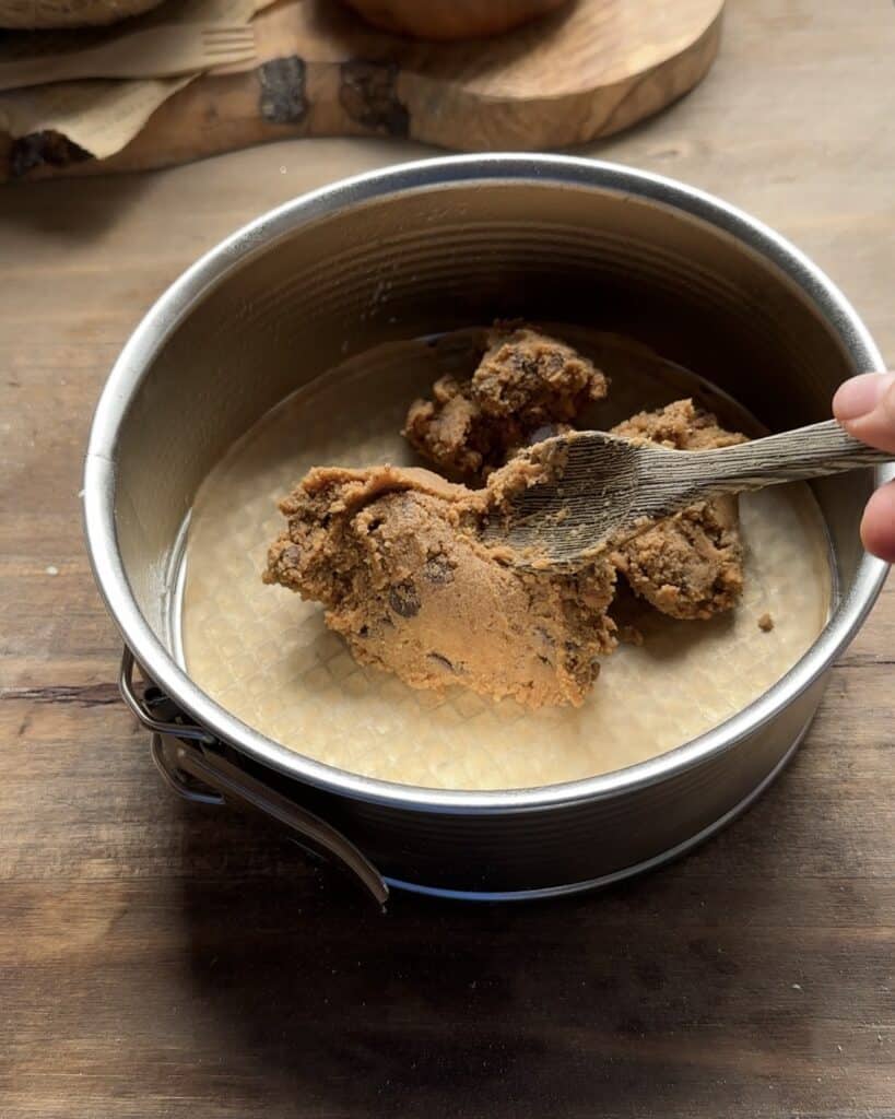 - Pour the edible cookie dough into the base of the pan and spread it evenly pressing it down firmly to create a compact and even crust. You should spread it all over the bottom and sides for better results.