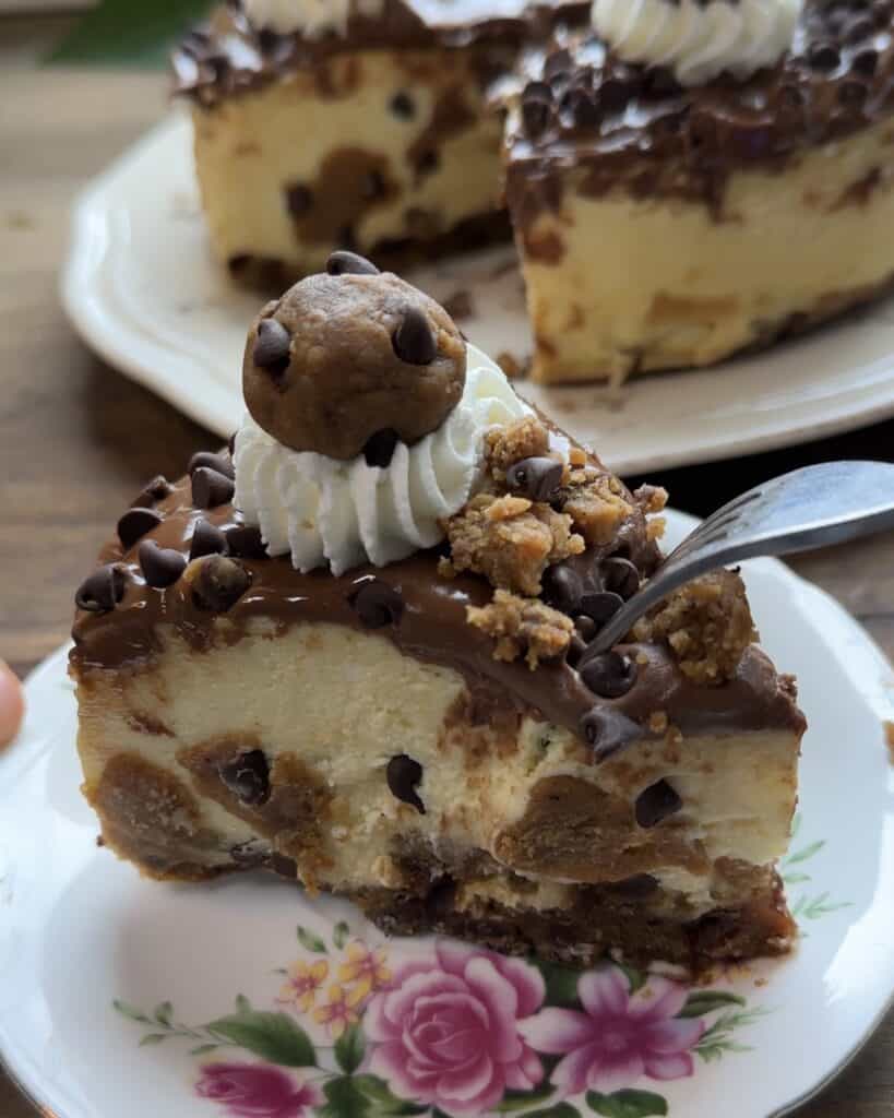 A cookie dough cheesecake is a delicious dessert that combines two of the most loved treats cookie dough and cheesecake. It starts with a cookie dough base, another layer of decadent velvety cheesecake, chunks of cookie dough and its topped with a delicious ganache.