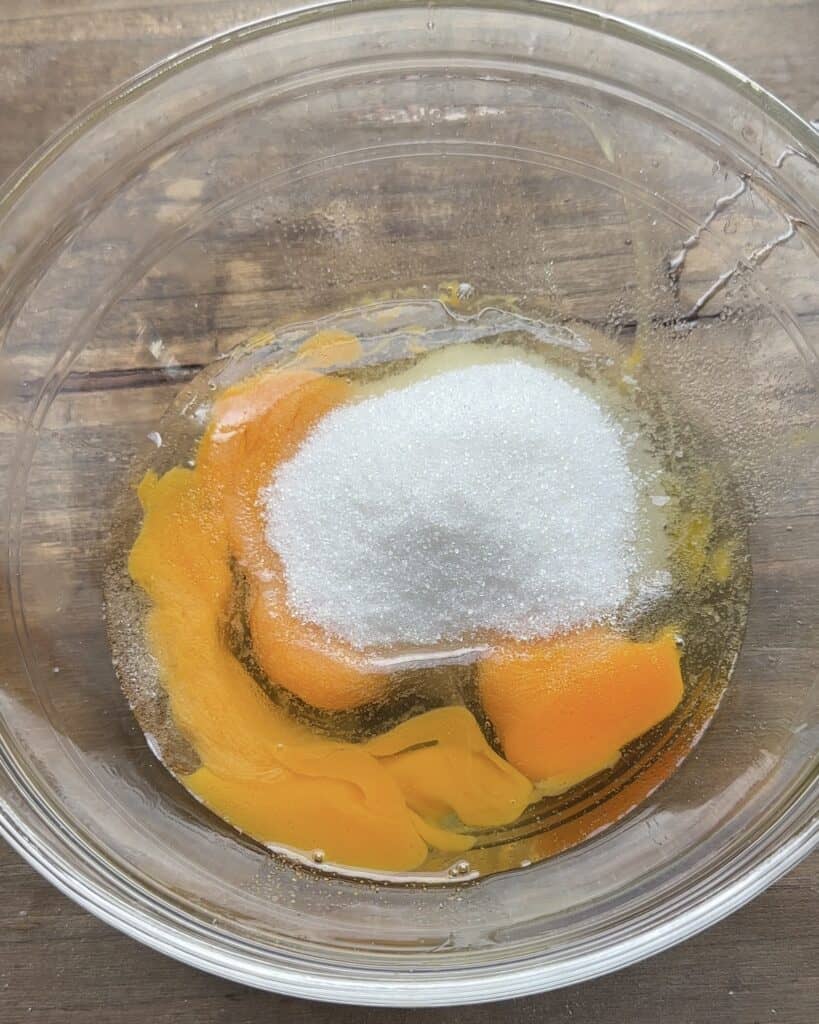 - In a clean and dry bowl, crack three eggs, add granulated sugar and whisk for about 1 minute to make sure both ingredients are well combined together.