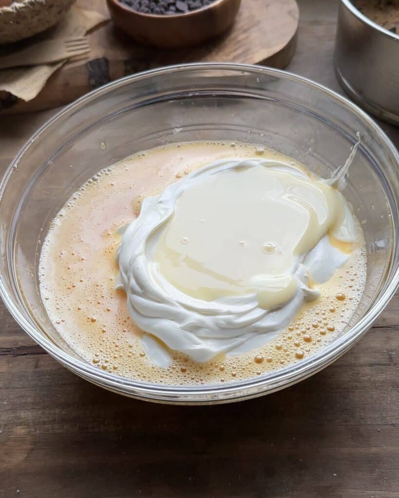 - Start by adding the cream cheese, condensed milk and greek yogurt. Then go ahead and add the cornstarch mixture and combine all the ingredients together using a whisk.