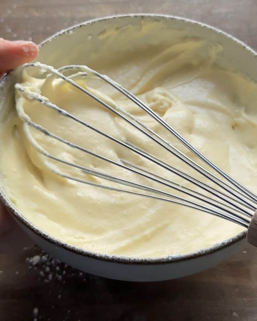 Start by adding the cream cheese, condensed milk and greek yogurt. Then go ahead and add the cornstarch mixture and combine all the ingredients together using a whisk.