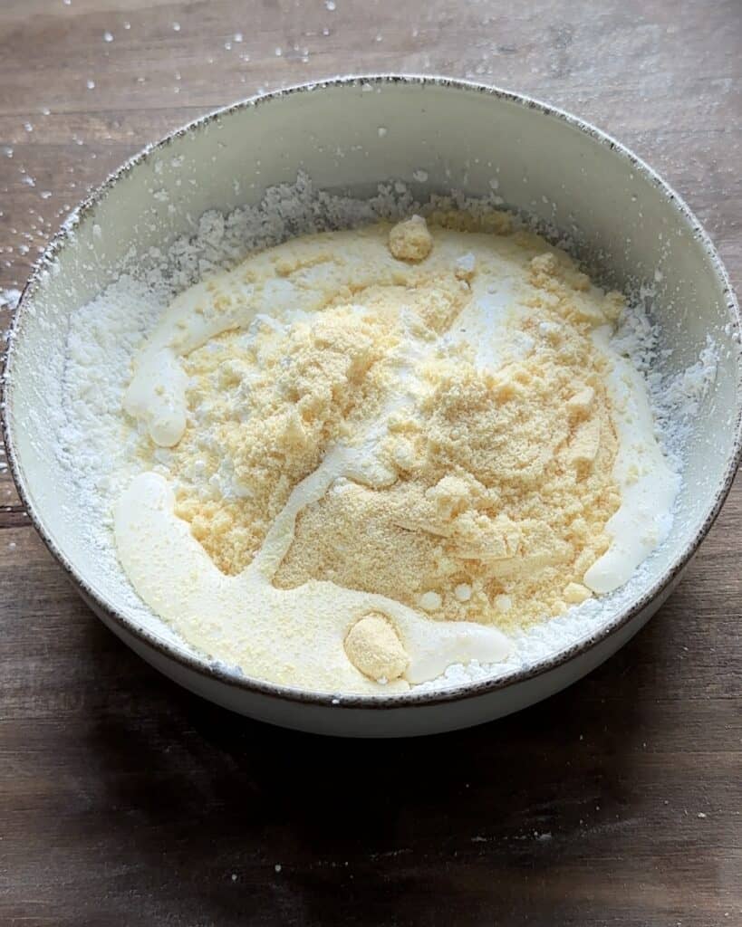 - In a separate bowl combine the cornstarch, milk powder and heavy cream. Whisk this mixture vigorously until it reaches a smooth and creamy consistency ensuring that there are no remaining lumps of cornstarch in the batter.