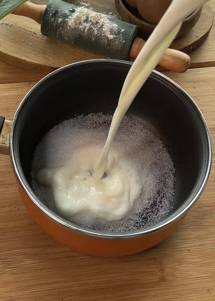 - In a separate bowl, whisk the egg yolks. Slowly pour the hot milk mixture into the yolks while whisking continuously to temper the eggs.