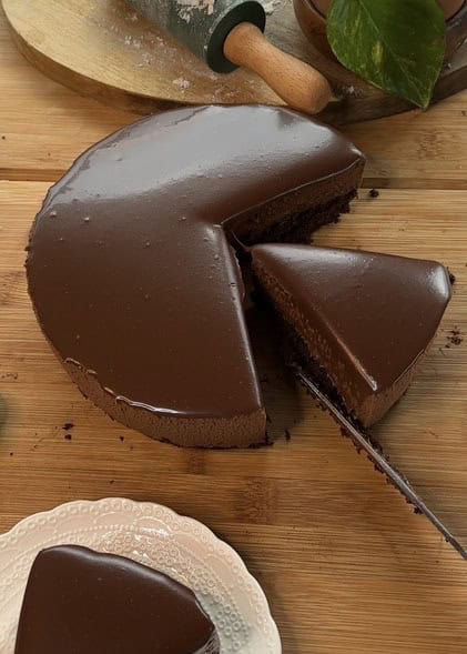 - Now, you’ll have a beautiful dark chocolate mousse cake with ganache that’s ready to serve and enjoy!