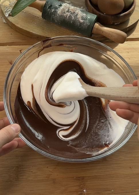 - Gently fold the whipped cream into the chocolate mixture, being careful not to overmix.