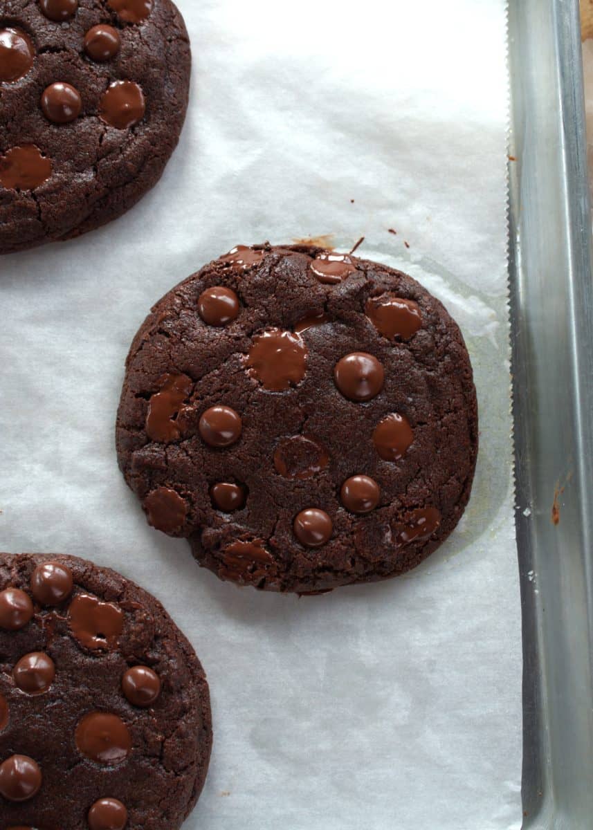 Delicious double chocolate cookies. Crispy edges, melted chocolate pockets, and chewy interior.