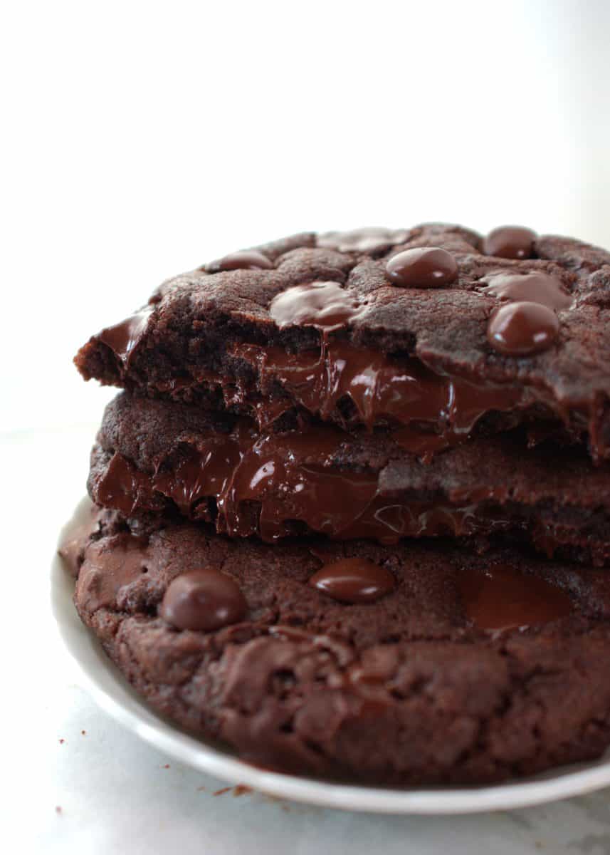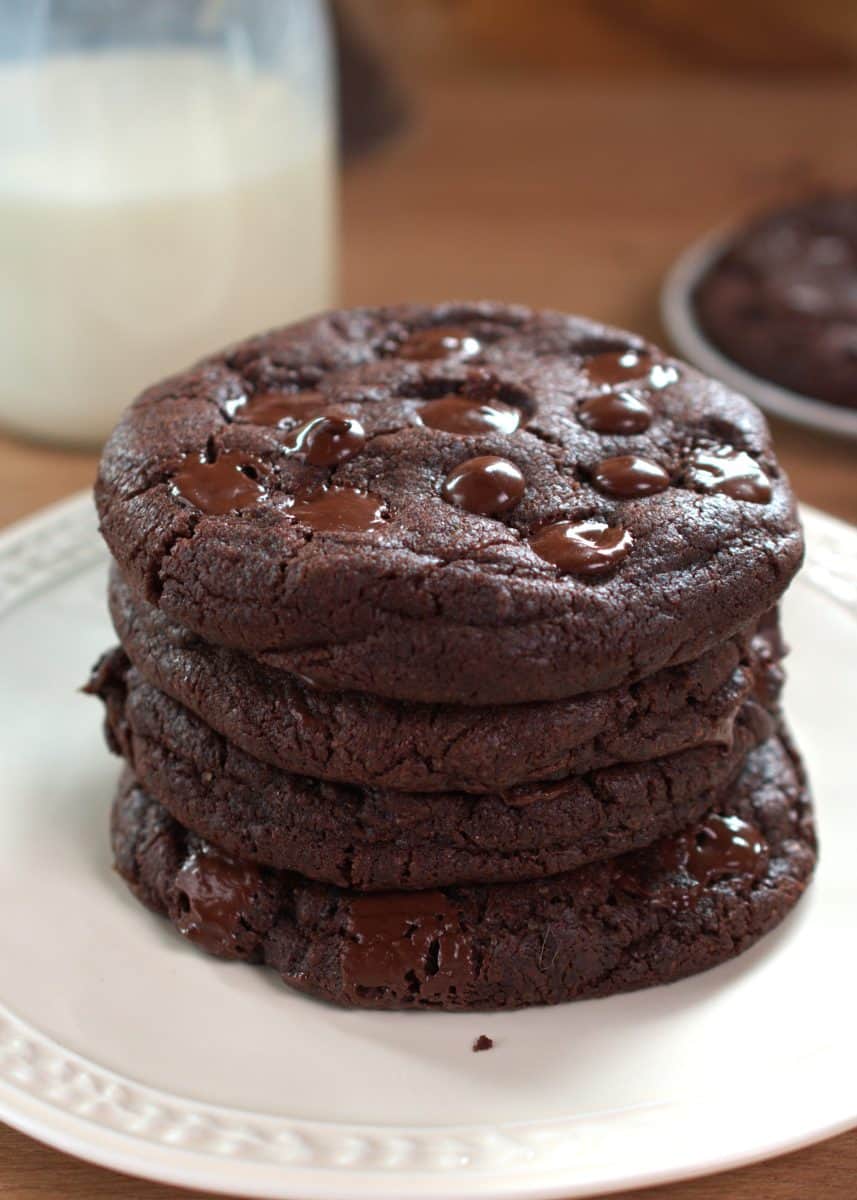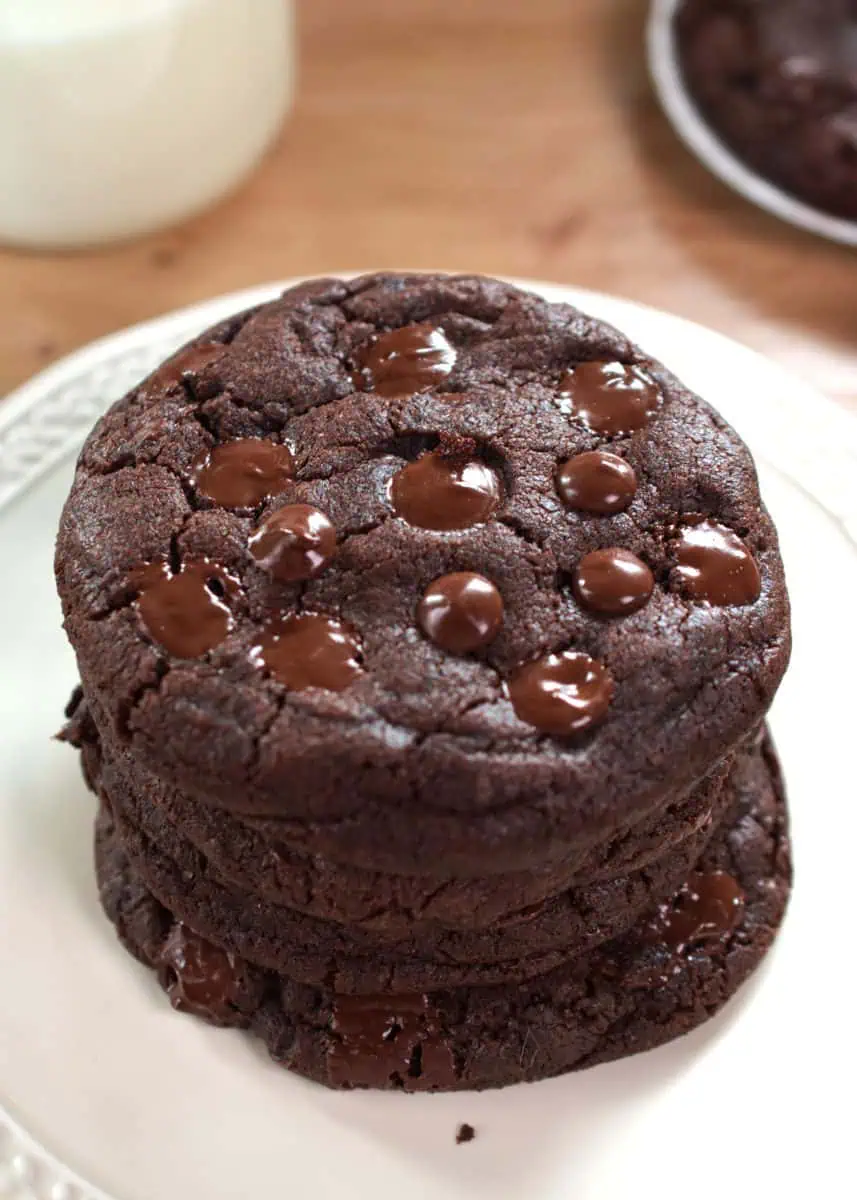 This recipe for double chocolate cookies gives you the best chocolate cookies with crispy edges and a chewy interior. The cookie has plenty of chocolate chips, creating melted chocolate pockets.