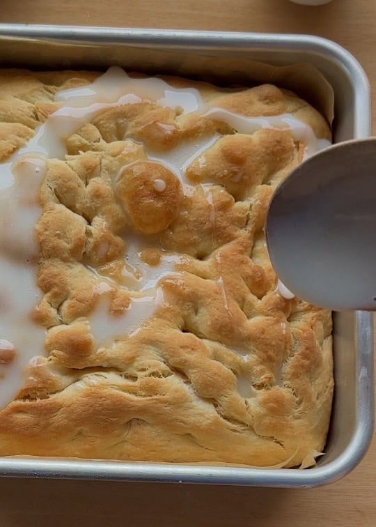 • Let the glaze set: after baking and cooling for 5 minutes, pour the glaze over the focaccia and let it rest for 15 minutes. This gives the glaze time to slightly harden, adding a shiny finish and balancing the soft, warm interior with a sweet coating.