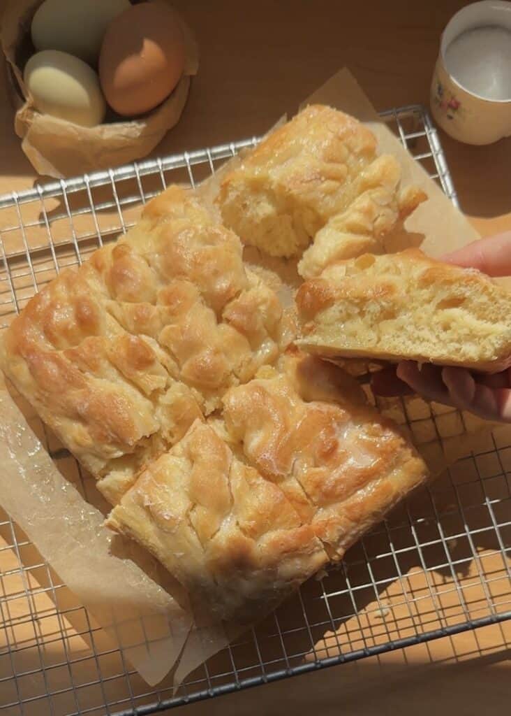 Preheat the oven to 180°C (356°F), and once it’s fully heated, bake your fluffy donut focaccia for about 23 to 25 minutes, or until the top is beautifully golden brown.