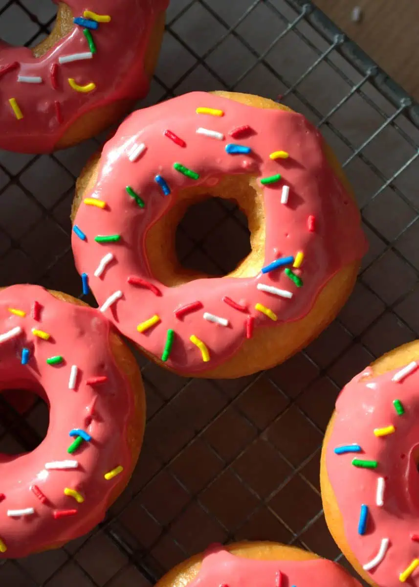 This recipe was inspired by the iconic Homer Simpson pink donuts. Made with a sweet donut dough, a pink chocolate coating, and colorful sprinkles. The texture of the donuts is fluffy and very soft. Sweet but not over-sweet, making it the perfect sweet treat.