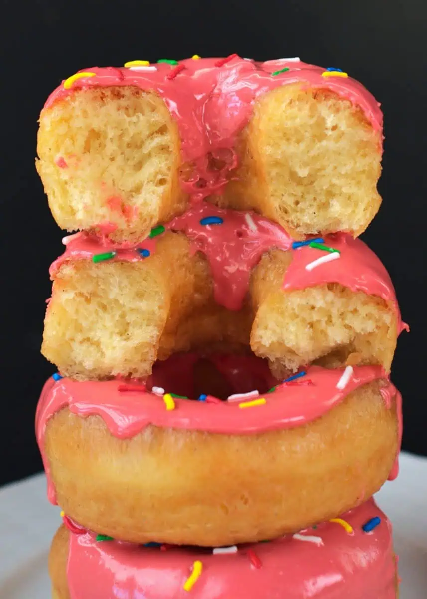 - Using the right amount of flour. Don’t add any extra flour to this recipe, or the donuts will be too dense. Make sure to weigh the ingredients instead of using measuring cups (we shared the recipe in both, so it’s easily accessible for everyone).