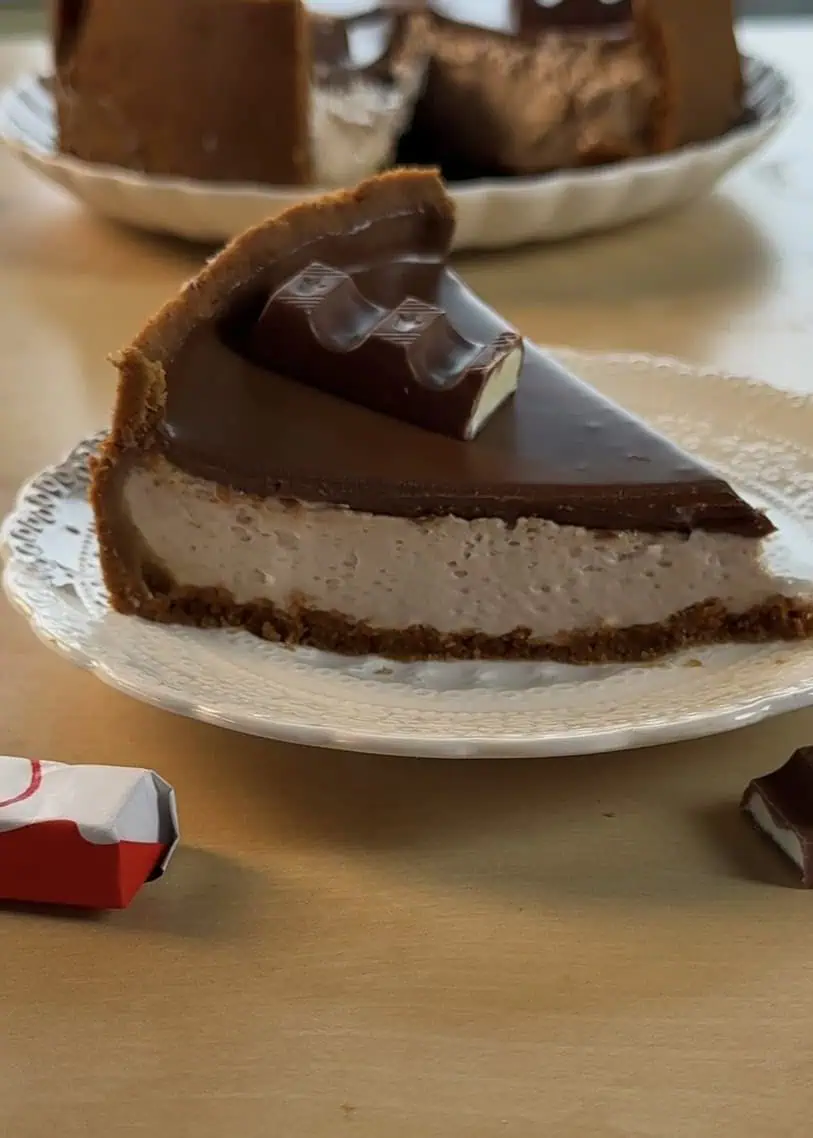 - Melt additional Kinder Maxi bars until smooth, pour or drizzle it over the set cheesecake, and immediately arrange Kinder Maxi halves around the top in a circular pattern. Chill again until the chocolate sets.