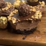 These mini Ferrero Rocher cheesecakes are the ultimate no bake Nutella Ferrero Rocher cheesecake dessert for any chocolate lover. With a rich Nutella cheesecake filling, an easy Oreo crust, and decadent Ferrero Rocher chocolates on top, each bite is creamy, crunchy, and absolutely irresistible.