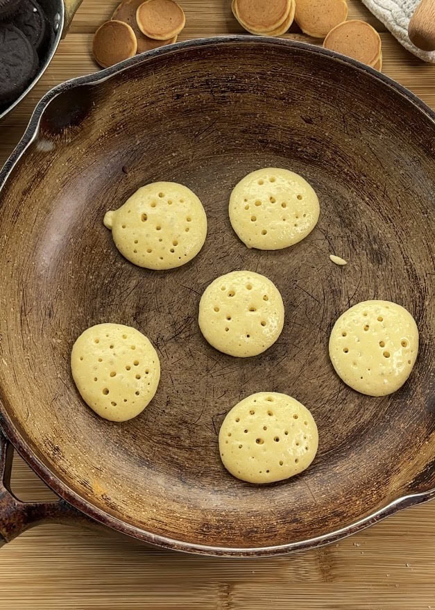 - Pipe small circles of batter into the pan, spacing them apart so they don’t merge. Think coin-sized for that perfect mini look.