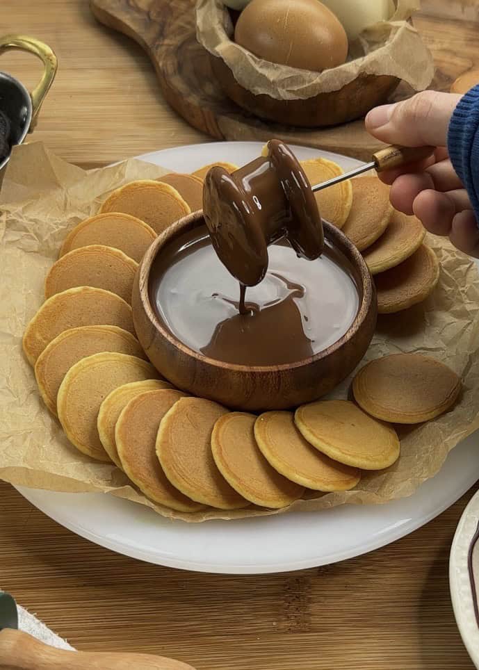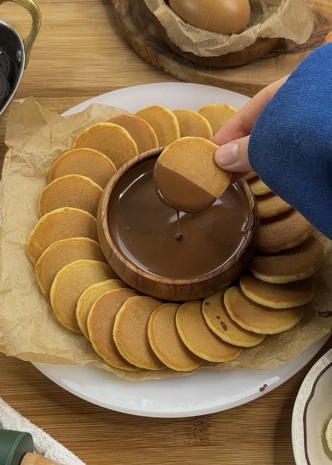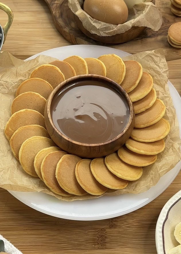 Mini pancakes + Nutella = guaranteed happiness. There’s something about the size that makes them even more fun to eat—especially when they’re warm, fluffy, and dunked in a pool of melted chocolate hazelnut goodness.