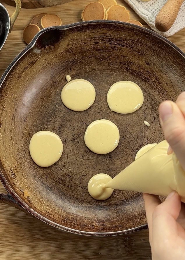 Once your batter is ready, spoon it into a piping bag or squeeze bottle. This makes it super easy to control the size of each mini pancake and helps you keep them evenly spaced in the pan. If you don’t have one, you can use a teaspoon or small scoop.