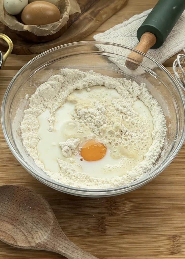 - Add the wet ingredients—crack in the egg, pour in the milk and oil, and whisk again until just smooth. Avoid overmixing to keep the pancakes light and fluffy.