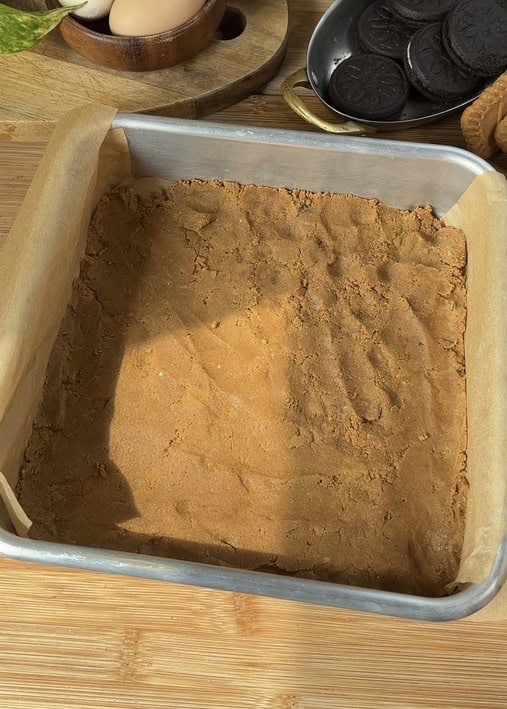 Press the mixture firmly into your baking pan—lining it with parchment first helps with removal later—and use your hands to smooth the surface evenly and place it in the freezer.