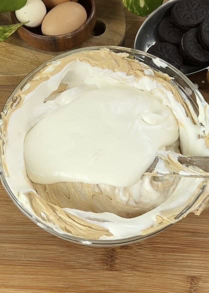 Gently fold the whipped cream into the cream cheese mixture just until no white streaks remain – be careful not to overmix, as this can leave a grainy texture.