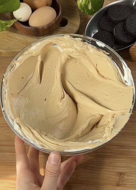 Pour half of the cream mixture over the set crust, smooth it evenly, then create a cookie layer by completely covering the surface with Biscoff cookies.