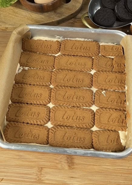 Place whole Biscoff cookies in a single layer over the filling