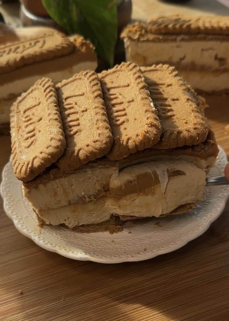 Making no-bake Biscoff dessert bars is very easy, and decorating them is super fun! Since I’m a very indecisive person (and I know many of you are too), I’m giving you two options to decorate this dessert. I recommend covering the cake with Biscoff spread and crushing some biscuits on the sides, then choosing one of two options: either place 6 biscuits in a straight line on top or arrange them slightly on top of each other so they’re not flat.