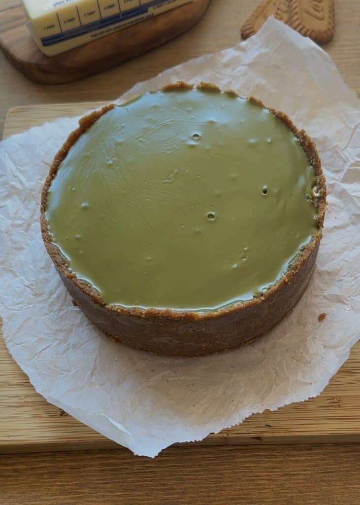 Pour it generously over the top of the cheesecake and tilt the pan so the pistachio cream spreads evenly all over.