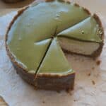 About 20 minutes before serving, microwave the pistachio cream until it’s runny. Pour it over the cheesecake and tilt the pan to spread the topping evenly. Put it back in the freezer to set.