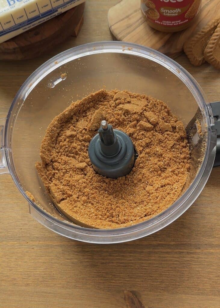 Add the Biscoff cookies to a food processor and pulse until they’re fully crushed into fine, sandy crumbs. You want that perfect texture so the crust holds together beautifully.